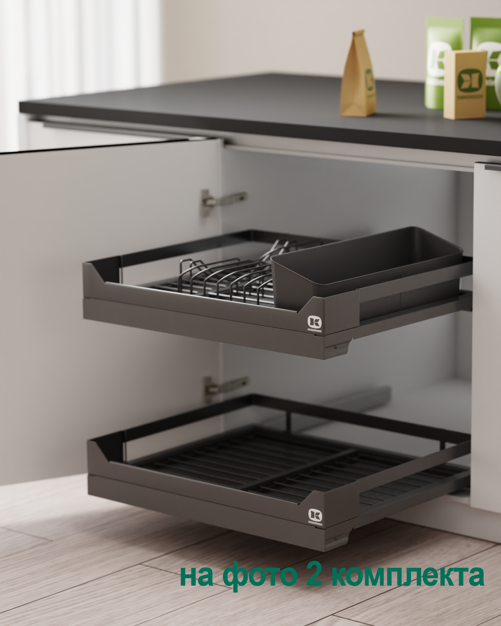 2 модуля для посуды большие (423 x 248 мм, каждый модуль состоит из 1 х держатель металлический, 1 х поддон пластиковый, 2 х защелка-ограничитель)